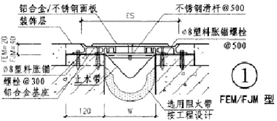 金屬蓋板型地坪變形縫——增加蓋板厚度,提高承載能力,采用滑桿確保變形縫裝置變位時仍能保持中心及原有位置。