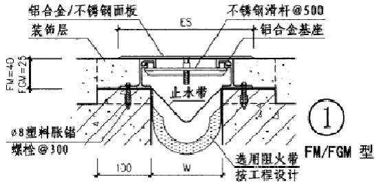 金屬蓋板型地坪變形縫——增加蓋板厚度,提高承載能力,采用滑桿確保變形縫裝置變位時(shí)仍能保持中心及原有位置。