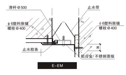 外墻變形縫(金屬蓋板型)EM 金屬蓋板型外墻變形縫——采用滑桿確保變形縫裝置變位時仍能保持中心及原有位置。 型號:EM,E-EM,SEM,EFM,E-EFM,SE-EM ◎ 50%位移量; 滑桿的設置確保變形縫裝置平穩變化; 優良的雙重防水性能,保護建筑; 面板可選用鋁合金、不銹鋼板或黃銅。